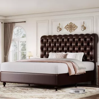 Queen Platform Bed Frame with 54″ PU Leather Tall Headboard and Wood Legs